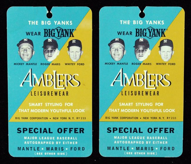 Description:Lot of (2) 1962 Amblers Big Yank clothing tags featuring Mantle, Maris, and Ford (VG-VG/EX). 3"x5 3/8" Amblers Leisurewear tags which picture Mickey Mantle, Roger Maris, and Whitey Ford. The back of each tag has a "Special Offer" coupon that could have been sent in for a baseball autographed by Mantle, Maris, or Ford. Tags exhibit handling wear including a few light creases, but display well overall: VG-VG/EX
