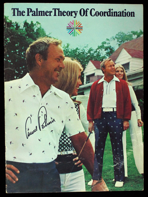 Description:Arnold Palmer signed 1973 Robert Bruce clothing advertising store brochure (VG/EX). 11"x15" (5)-page brochure which displays (4) different coordinated outfits that Palmer is modeling. Palmer signed the cover in black marker. Signature rates 9 out of 10. Brochure exhibits some handling wear including minor creasing: VG/EX