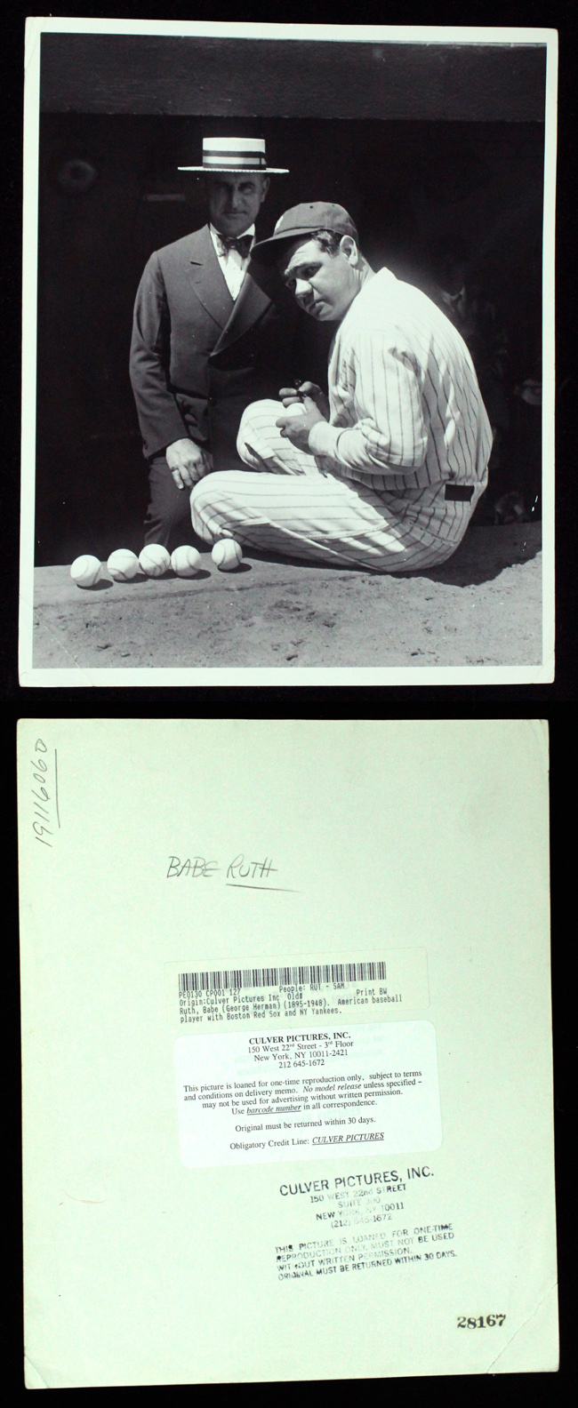 Description:Vintage 8"x10" b&w photo of Babe Ruth signing baseballs c.1950s (VG-VG/EX). Classic image of Ruth sitting at the dugout signing a grouping of baseballs. The back of the photo has Culver Pictures, Inc. stampings and labels. The photo displays well overall and exhibits creasing at the bottom corners and other minor wear: VG-VG/EX