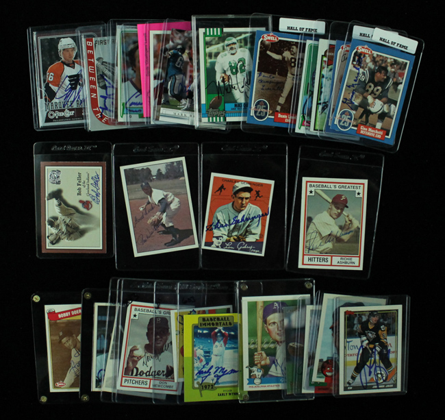 Description:Lot of (46) signed baseball, football, and hockey cards/flats with HOFers and stars (EX-MT). Includes: (19) signed baseball cards/flats (mainly 1980s issues) with Willie Stargell (Perez-Steele HOF postcard, PSA/DNA encapsulated), Richie Ashburn, Al Kaline, Jim Catfish Hunter (1993 Nabisco, SGC 88 NM/MT), Pee Wee Reese, Charlie Gehringer (reprint 1934 Goudey), Luke Appling, Hoyt Wilhelm, Don Newcombe, Al Lopez (reprint 1934-36 Diamond Stars), Early Wynn, Joe Niekro, Paul Molitor, Gus Zernial, Al Rosen, Bob Feller, Bobby Doerr, Orlando Cepeda, and George Kell. (16) signed football cards/flats (mainly 1980s-90s issues) with Herb Adderly (postcard, PSA/DNA encapsulated), Tommy McDonald (2001 Topps Team Legends, SGC 96 MT), Gino Marchetti, Andy Robustelli, Earl Campbell, Ken Stabler, Harry Carson, (2) Dante Lavelli (one is a signed business card), Mike Quick, Mark Brunell, Gary Clark, Conrad Dobler, Chuck Bednarik, Ronnie Lott, and Merlin Olsen. And (11) signed hockey cards/flats - Mario Lemieux (4"x7" Coca-Cola photo, personalized), Dominik Hasek (dollar bill), Clark Gillies, Grant Fuhr, Claude Giroux, Jaromir Jagr, Teemu Salanne, Jason Smith, Darryl Sittler, Eris Weinrich, and Eric Desjardins. All are signed in ink or marker and rate 9 out of 10 on average: EX-MT