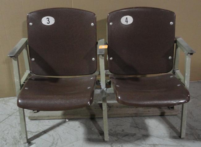 Description:Connected pair of original Veterans Stadium seats (EX). Original brown plastic seats with metal legs and rails, are seats 3 and 4 from unknown section of Veterans Stadium. Seats show typical wear with areas of surface scratches visible. They have been semi-bolted to a wooden base, with one side not bolted down: EX