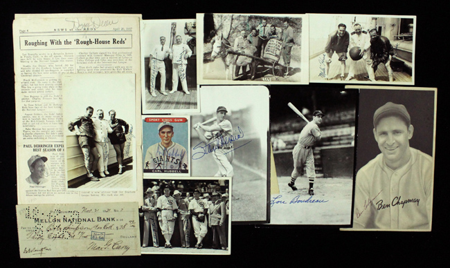 Description:Lot of (27) mostly vintage baseball autographs on photos and other assorted flats including Dizzy Dean (EX overall). Includes: Dizzy Dean signed 6"x9.5" 1937 "News of the Reds" publication page (signed in pencil); Max Carey signed bank cancelled check dated 1931; a Jimmie Dykes, Mule Haas, & one other multi-signed 3.5"x5.5" b&w photo (JSA COA); Joe Renick, Lester Balaski, & Buddie Haas multi-signed 4"X6" b&w photo by George Burke; a "Moose" Salters, Eddie Smith, Mule Haas, & Taft Wright multi-signed 3.5"x5.5" b&w real photo postcard (JSA COA); Mule Haas & Jimmie Dykes dual-signed 3.5"x5.5" b&w photo (JSA COA); Ben Chapman signed 1939 R303-C Goudey Premium; Carl Hubbell signed reprint 1933 Goudey Sports Kings card; a 4.5" square sheet signed by (6) including Oral Hildebrand, Sam West, John Babich, Ival Goodman, and others; a Lou Boudreau signed 5"x7" b&w photo, and a Stan Musial signed 5"x7" b&w photo. Signatures rate 8 to 10 out of 10: EX overall.