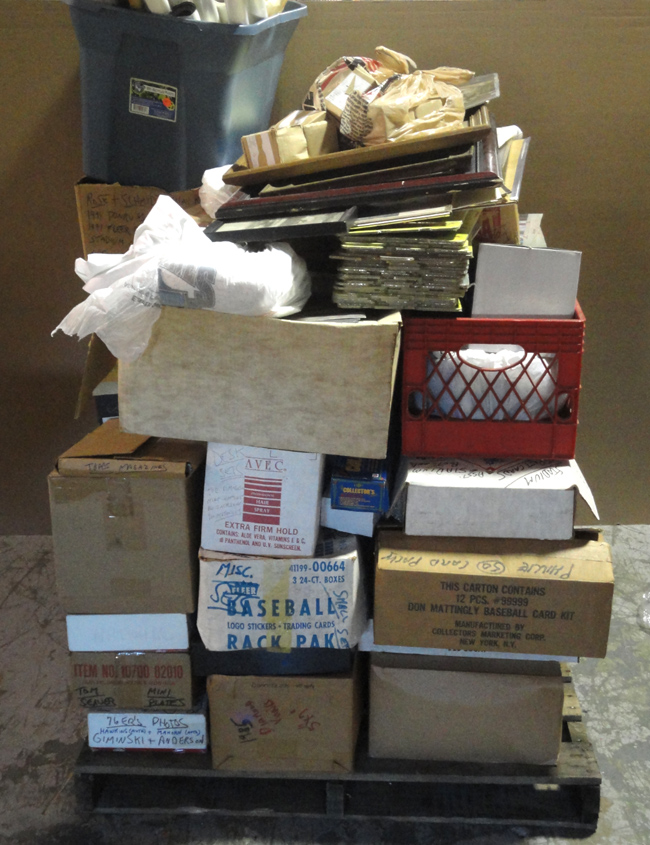 Description:Pallet size lot of assorted sports memorabilia and cards c.1980s (EX-NM overall). Includes a wide assortment of items ranging from approx. (50,000) sports cards, glassware, posters, modern postcards, player photos, signs, pins, souvenirs, and other misc. collectibles. Great breakdown value. Lot is recommended for preview. Range EX-NM overall. ***Please note that due to the size and weight, S/H will be substantial.***