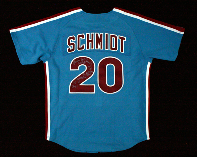 Description:Michael Jack Schmidt full name signed & multi-inscribed (5 inscriptions) Mitchell & Ness 1980 style Phillies jersey (NM). Mitchell & Ness Cooperstown Collection size 44 Philadelphia Phillies #20 Mike Schmidt 1980 style throwback jersey signed "Michael Jack Schmidt" in silver marker with "HOF 95" "548 HR" "12 All Star Games" "10 Gold Gloves" "1980 WS Champs" inscriptions. Signature rates 9/10 out of 10. Jersey is unworn, with retail tags still attached: NM