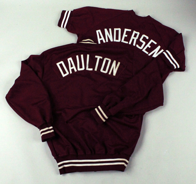 Description:Darren Daulton and Larry Andersen professional model Philadelphia Phillies jackets c.1980-86 (VG/EX-EX). Includes a zipper front jacket with "DAULTON" nameplate on back and Phillies "P" logo on front left. Retains Rawlings size 42 tag on the inner front (dates to 1985-86). Jacket exhibits moderate usage wear with scattered surface soiling/spotting and a small tear on the back (VG/EX). Also includes a pull over jacket with "ANSERSON" lettering across back and "phillies" across front. Retains Rawlings size 42 tag on the interior. Exhibits light usage wear (EX).