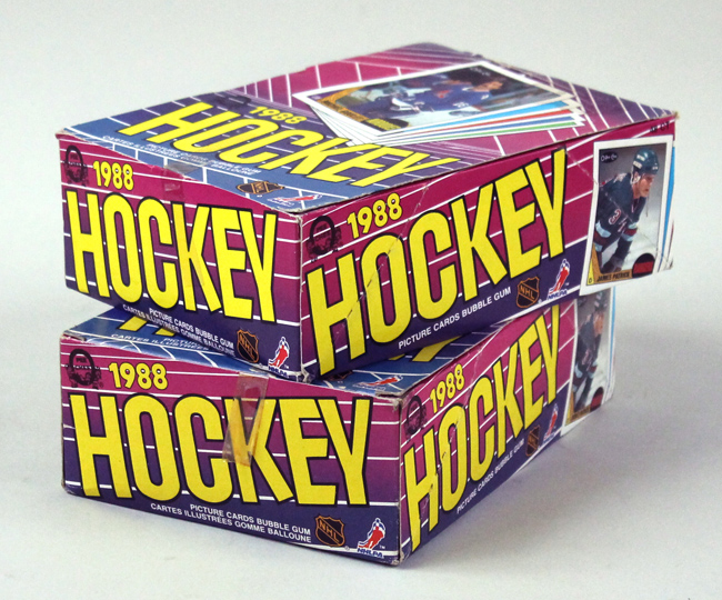Description:Lot of (2) unopened 1987/88 O-Pee-Chee Hockey wax boxes (EX-EX/MT). Each box contains (48) unopened packs. The boxes exhibit virtually no handling wear, but exhibit some signs of being exposed to moisture including scattered spotting on the boxes and wrinkling to the wax packs. The moisture exposure does not appear to have effected the cards within the packs other than the typical gum staining which occurs to the cards nearest to the top: EX-EX/MT