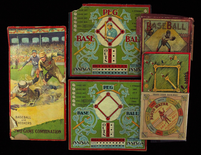 Description:Lot of assorted vintage baseball game boards and box pieces c.1900-20s (PR-VG). Includes: 1900 "Baseball Game" by McLoughlin Bros. box lid (missing part of lower right corner, moderate soiling throughout, PR); c.1912 "Grand-Stand Base Ball" spinner board (missing spinner, VG); 1910s "Peg Base Ball" box lid (no sides, missing part of upper left corner, PR/GD)) and game board (VG); 1920s "Baseball and Checkers Two Game Combination" box lid (no sides, edge wear including some loss, name written in ink, PR/GD), and an unidentified 7" square baseball field playing board (VG).