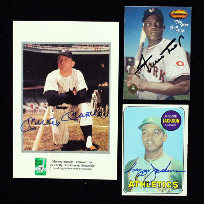 Description:Mickey Mantle, Willie Mays, and Reggie Jackson autograph lot (VG-EX). Incl. 1969 Topps #260 rookie card signed by Reggie Jackson (VG/EX oc); 4"x6" photo card signed by Mickey Mantle (EX); and 1993 Ted Williams Co #126 signed by Willie Mays (VG, crease). Signatures rate 8 (Mays) to 10 out of 10: VG-EX