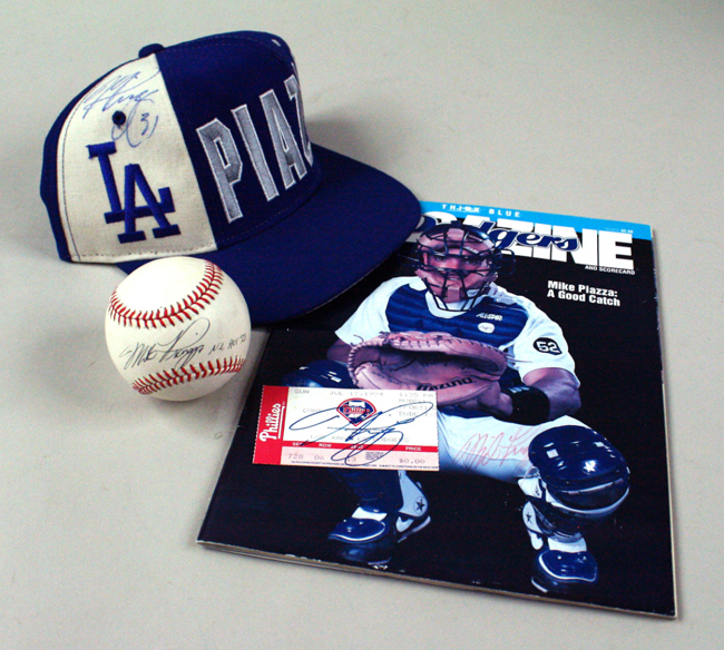 Description:Mike Piazza signed baseball, signed ticket, signed hat, and signed program (EX-NM). Incl. W.White NL ball signed by Piazza in black ink with "NL ROY 93" inscription rating 8/9 out of 10; July 17th 1994 Philadelphia Phillies ticket stub from game vs Los Angeles Dodgers signed by Piazza in blue marker rating 9/10 out of 10; Starter snapback Dodgers Mike Piazza hat signed by Piazza in blue marker with "31" inscription rating 8 out of 10; and 1993 Dodgers program signed by Piazza in red marker rating 6 out of 10: EX-NM