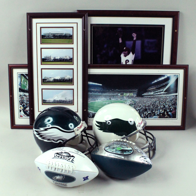 Description:Lot of assorted sports memorabilia and framed items (EX-MT). Framed items include "Good Bye Veterans Stadium" framed display; Reggie White, Donovan McNabb, Ron Jaworski, Harold Carmichael framed display; (4) framed 16"x20" photos including Jim Kelly, Tug McGraw, Jeremy Roenick, and Freddie Mitchell "4th & 26". Also includes full size Riddell Philadelphia Eagles VSR-4 helmet; Full size Riddell Eagles throwback helmet; (2) Eagles commemorative footballs; Lincoln Financial Field and Philadelphia Phillies driveway signs; Phillies toy helicopter; and other items. Frames show various degrees of wear, with most having screw holes on both sides: EX-MT