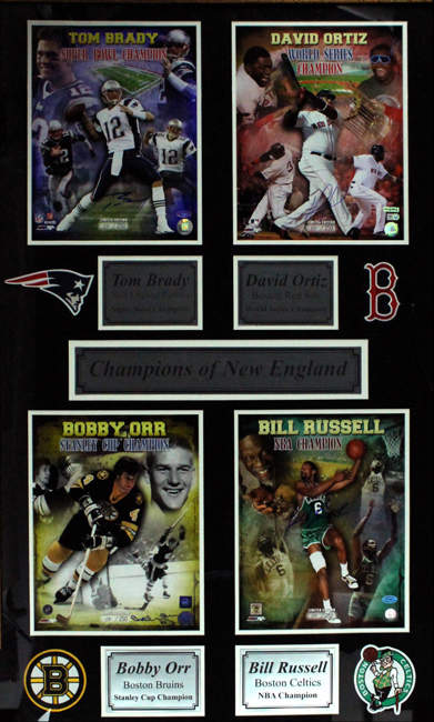Description:"Champions of New England" multi-signed limited edition framed display with Russell, Orr, Brady, Ortiz (NM). 32"x50" framed display containing photo signed by Bill Russell (Hollywood Collectibles Bill Russell sticker), photo signed by Bobby Orr with "#4" inscription (Great North Road Marketing Bobby Orr sticker), photo signed by David Ortiz (MLB & UDA), and photo signed by Tom Brady (Tri-Star). Signatures rate 8/9 to 10 out of 10. Each is numbered 54/250: NM appearance