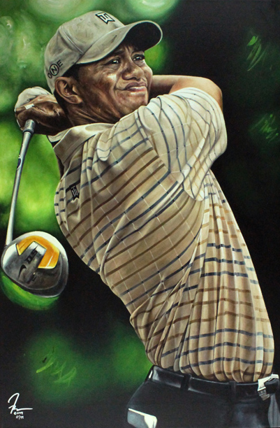 Description:Tiger Woods hand embellished giclee on canvas signed by artist Justyn Farano (NM). 24"x36" canvas with hand embellished giclee which depicts the golf swing follow through of Woods. Signed at the bottom left corner by artist Justyn Farano. Hand numbered "17/99": NM