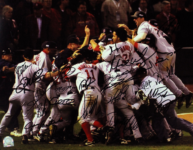 Description:2004 Boston Red Sox team signed 11"x14" photograph, MLB Authenticated (NM). Signed by (22) members of the 2004 World Series champion Red Sox including Terry Francona, Manny Ramirez, Curt Schilling, Jason Varitek, Kevin Millar, Mark Bellhorn, Johnny Damon, Gabe Kapler, David Ortiz, Tim Wakefield, Keith Foulke, and others. Signatures rate 8/9 to 10 out of 10. MLB Authenticated serial #ed hologram sticker is affixed: NM