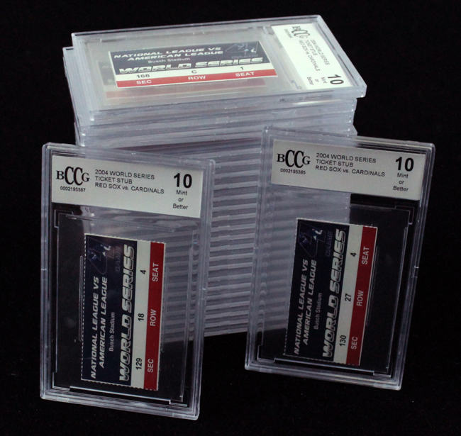Description:Lot of (25) 2004 World Series Game 4 ticket stubs all graded Beckett 10 (MT). Incl. (25) 2004 World Series ticket stubs from Game 4 in which the Boston Red Sox defeated the St. Louis Cardinals 3-0 to win the World Series. All have been graded 10 (Mint or Better) by Beckett: MT