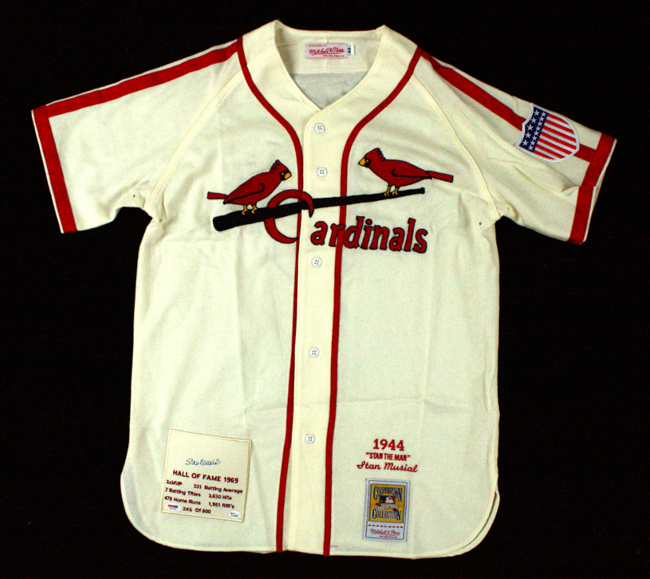 Description:Stan Musial signed limited edition St. Louis Cardinals throwback jersey, PSA/DNA (NM). Mitchell & Ness Cooperstown Collection size 44 Cardinals #6 Stan Musial 1944 style jersey. A patch has been sewn on the front tail, embroidered with various career stats and achievements. Musial signed the patch in blue marker. Signature rates 8/9 out of 10. Comes with COA from PSA/DNA (Online Authentics and PSA/DNA serial #ed stickers are affixed). Patch is also embroidered "246 of 500": NM