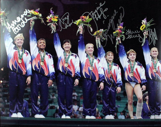 Description:1996 USA Women's Gymnastics team signed 16"x20" photograph (NM). Signed by (6) members of the Gold Medal winning team including Shannon Miller, Dominique Moceanu, Kerri Strug, Amy Chow, Amanda Borden, and Jaycie Phelps. Only Dominique Dawes is missing. Signatures rate 8/9 to 10 out of 10: NM