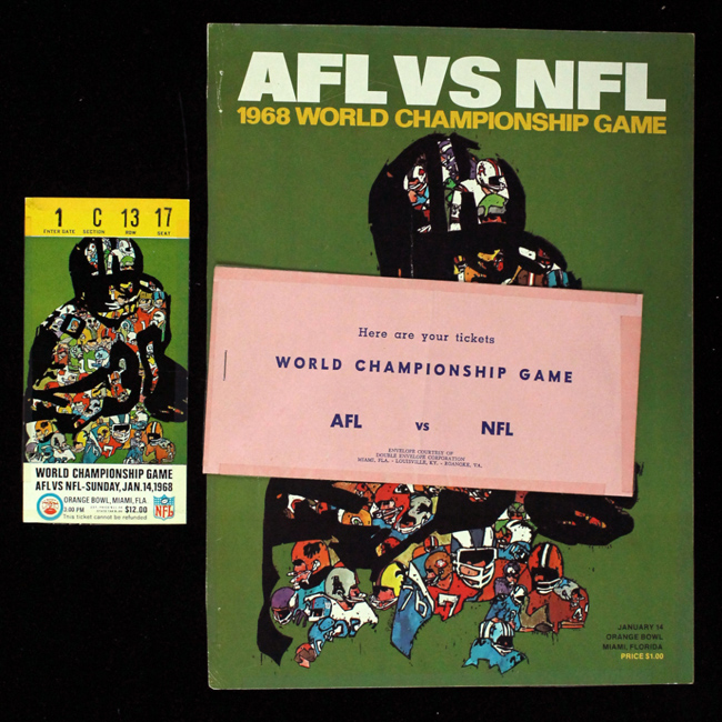 Description:1968 Super Bowl II ticket stub, ticket envelope, and program cover (VG, taped). Includes original ticket stub from the January 14, 1968 World Championship Game played at the Orange Bowl in Miami, Florida; ticket envelope which reads "Here are your tickets - World Championship Game AFL vs NFL"; and the front cover of the game's official program. Each piece has clear tape affixed to the sides of its front: VG overall