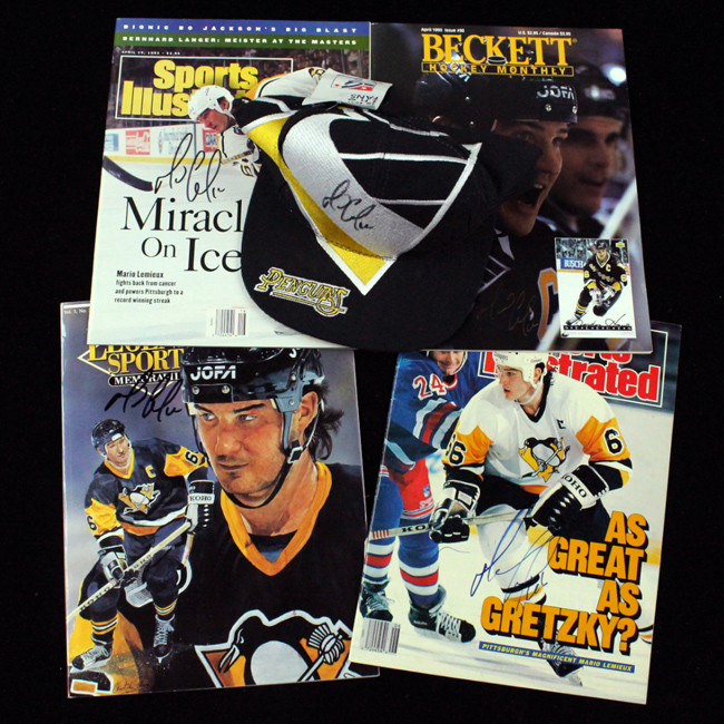 Description:Mario Lemieux signed Pittsburgh Penguins hat and (4) signed magazines (EX/MT-NM). Includes: The Game adjustable Penguins hat signed by Lemieux in black marker; Feb 6th 1989 Sports Illustrated signed by Lemieux in blue marker; 1992 Legends Sports Memorabilia price guide signed by Lemieux in black marker; April 1993 Beckett Hockey price guide signed by Lemieux in gold marker; and April 19th 1993 Sports Illustrated signed by Lemieux in black marker. Signatures rate 8 to 9/10 out of 10: EX/MT-NM