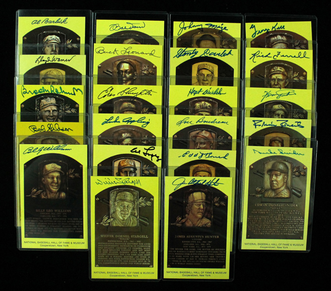 Description:Lot of (22) signed yellow Baseball Hall of Fame plaque postcards (NM). Includes: Willie Stargell, Jim Catfish Hunter, Duke Snider, Robin Roberts, Fergie Jenkins, Edd Roush, Lou Boudreau, Hoyt Wilhelm, Stanley Coveleski, Johnny Mize, Buck Leonard, Bob Doerr, Billy Williams, Bob Gibson, Brooks Robinson, Rick Ferrell, Al Lopez, Lloyd Waner, George Kell, Luke Appling, Enos Slaughter, and Al Barlick. All are signed in marker. Signatures rate 8 to 10 out of 10: NM