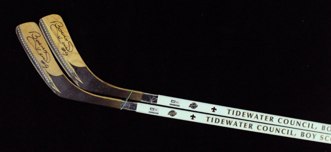 Description:Lot of (2) Bobby Hull signed hockey sticks (EX/MT). Both are "Tideater Council, Boy Scouts of America" sticks signed by Bobby Hull in black marker on the blade. Signatures rate 8/9 out of 10: EX/MT