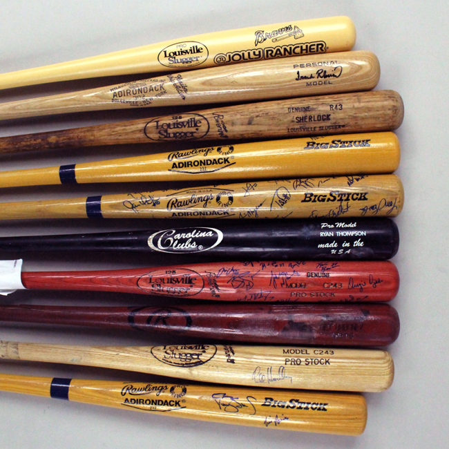 Description:Lot of (10) assorted signed and/or professional model bats including some stars (EX overall). Includes: Frank Robinson signed 34" Adirondack bat; a Darryl Strawberry & Tim Raines dual-signed 33" Rawlings Adirondack bat; Alan Trammell signed 33" Rawlings Adirondack bat; 1997 Rey Ordonez 34" Rawlings professional model bat (456B model # stamped on the knob end, "0" is written in black marker on both ends, heavy usage wear and is cracked); a Ryan Thompson professional model Carolina Cubs model bat (signed in gold marker, heavy usage wear); Glenn Sherlock professional model 34" Louisville Slugger R43 model bat (signed black marker, exhibits moderate usage wear); Ryan Klesko signed 30" Louisville Slugger Braves souvenir bat; Todd Hundley signed 34" Louisville Slugger C243 Pro Stock bat (exhibits moderate usage wear and is cracked); 1996 USA Baseball team-signed 34" Louisville Slugger bat with (16) signatures including Troy Glaus and Travis Lee; and a multi-signed 34" Rawlings Adirondack bat with (30) signatures including Wes Chamberlain, Rich Dempsey, and others (no major stars): EX overall.