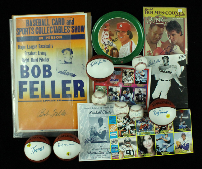 Description:Large lot of assorted autographed sports memorabilia c.1980s-90s (EX-NM overall). Includes approx. (500) autographs from baseball, basketball, hockey, football, boxing, and a few other sports. Some of the highlights include (64) signed baseballs (many are minor league game-used balls) with a few notables being Maury Wills, Dennis Martinez, Tony Oliva, Jim Hickman, Tom Browning, Ron Guidry, Al Bumbry, Tony LaRussa, Tony Cloninger, Rusty Kuntz, and Frank Malzone (includes a few multi and team-signed balls as well); (6) signed mini basketballs with Kevin McHale, Dick McGuire, Tubby Smith, and Lefty Driesell; a Bob Feller signed Baseball Card show appearance poster, Tug McGraw signed 7-Up plastic plate, John Paxson signed collectors plate, approx. (150) signed cards (mainly minor league hockey); approx. (150) signed flats, magazines, programs, etc. with some stars, but mainly minor league and college players; and a few other misc. signed items. Please note that although we do our best to screen each autograph for authenticity, due to the quantity and nature of the autographs in this lot, a small percentage may be clubhouse, secretarial, or non-authentic: EX-NM overall ***Please note that due to the size and weight, S/H may be substantial.***