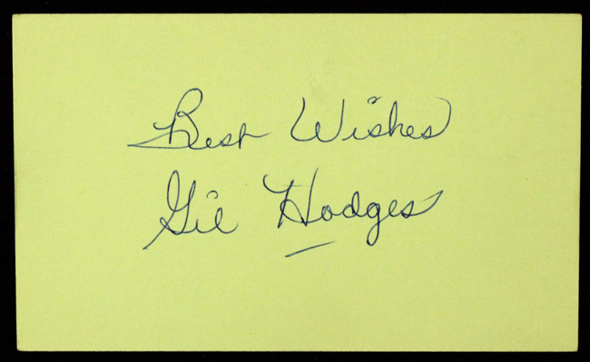 Description:Gil Hodges signed 3"x5" index card (NM). Unlined yellow index card signed by Hodges in blue ink with "Best Wishes" inscription. Signature rates 9/10 out of 10: NM