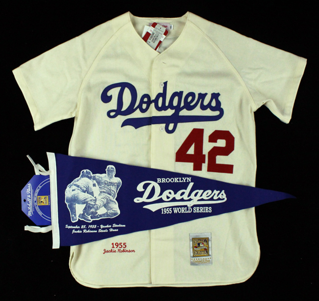 Description:Jackie Robinson 1955 Brooklyn Dodgers throwback jersey and 1955 World Series commemorative pennant (NM/MT). Includes a Mitchell & Ness size 46 Jackie Robinson 1955 Brooklyn Dodgers throwback jersey. Jersey is unworn with retail tags attached. Also includes a Mitchell & Ness 29.5" blue 1955 Brooklyn Dodgers World Series commemorative pennant with "Jackie Robinson Steals Home" graphic: NM/MT