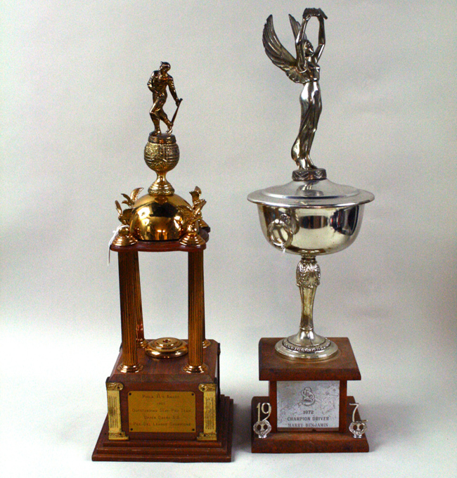 Description:Lot of (3) vintage sports trophies including baseball, golf, and racing (VG-EX). Includes: c.1930s "Audubon Golf Classic Winner - Low Gross" metal trophy cup (10" tall, tarnished, otherwise EX-EX/MT); 26" tall 1950 Philadelphia A's Award for "Outstanding Semi-Pro Team - Upper Darby A-A - Pen-Del League Champions" (figural baseball player on top, missing a piece that was attached at the center, otherwise EX); and a 30" tall 1972 URC Sprint Car Race "Champion Driver" trophy awarded to driver Harry Benjamin (missing the "2" on the die cut year, crack at the base of the metal shaft, tarnished, and the interior screw and bolt needs tightened, VG). ***Please note that due to the size of the trophies, S/H may be substantial.***