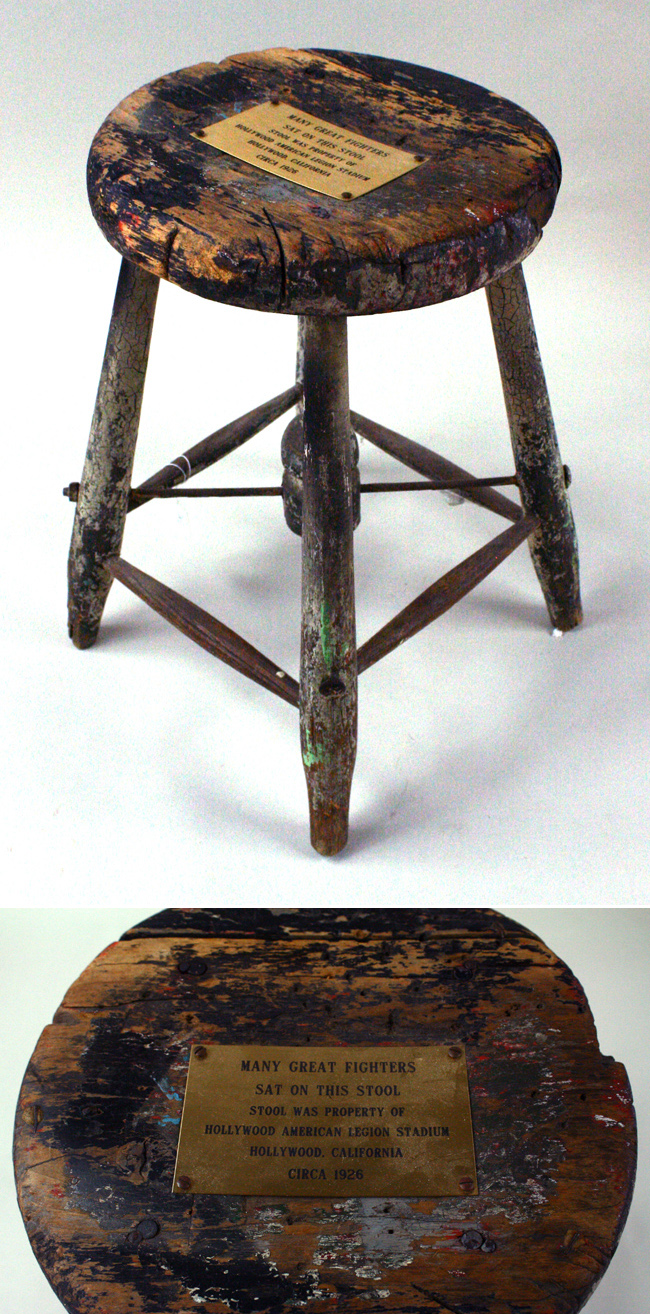Description:Original wooden stool from Hollywood American Legion Stadium c.1926 (VG). 17" tall wooden stool with a metal placard affixed to the top which reads "Many great fighters sat on this stool - Stool was property of Hollywood American Legion Stadium - Hollywood, California - Circa 1926". Stool exhibits heavy usage wear including an edge chip, cracking, and surface wear: VG