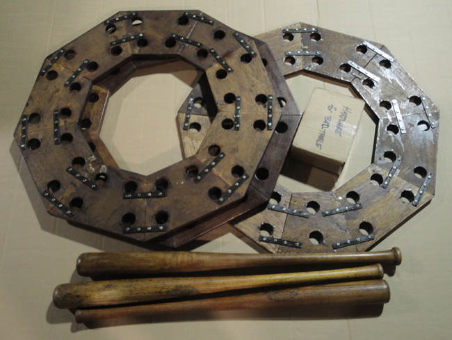 Description:Large Folk Art baseball display stand which partly originated from Robin Roberts personal collection (unassembled, EX). Handmade wooden tiered display stand features three level shelves with (102) receptacles that once displayed Robin Roberts' personal collection of game used win baseballs. The stand originally was supported by three baseball bats from Roberts' personal collection, but now includes (2) vintage Louisville Slugger bats (one has a cracked handle) and a vintage bat with no manufacturer markings that did not originate from Roberts' collection. The stand is currently unassembled, but includes all of the necessary hardware and pieces to be reassembled (the bats are not predrilled): EX overall ***We have provided a photo of the display stand assembled as it was originally offered as lot 259 in our April 12, 2011 Live Auction. It does not include the three bats that were originally sold with it.***