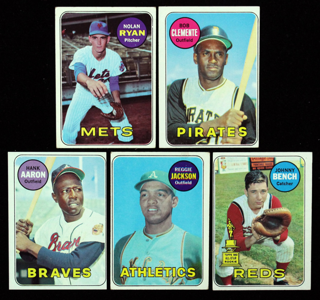Description:1969 Topps Baseball partial set of (531) cards (EX-EX/MT overall). Key cards grade: #s 50 Clemente (VG/EX (OC)), 95 Bench (VG (OC)), 100 Aaron (NM miscut), 260 Jackson (VG), and 533 Ryan (VG). Set grades EX-EX/MT overall with some lesser or better grade.