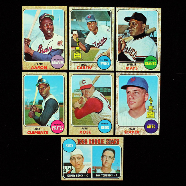 Description:1968 Topps Baseball partial set of (432) cards (EX-EX/MT overall). Key cards include: #s 45 Seaver (EX/MT-NM), 50 Mays (EX (OC)), 80 Carew (EX miscut), 110 Aaron (EX/MT (OC)), 150 Clemente (EX (OC)), 230 Rose (EX), and 247 Bench (VG). Set grades EX-EX/MT overall with a few lesser or better grade.