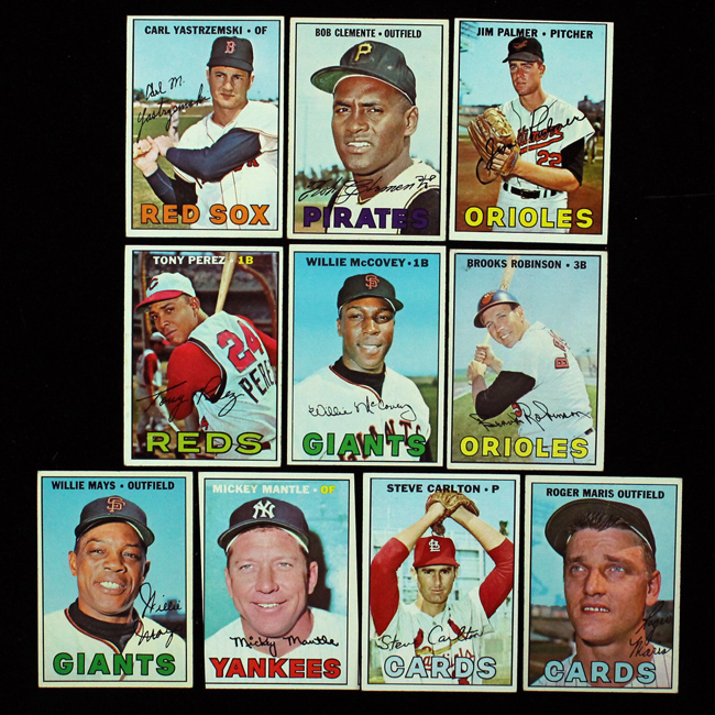 Description:1967 Topps Baseball partial set of (320) cards (EX overall). Key cards include: #s 45 Maris (VG), 146 Carlton (EX), 150 Mantle (EX miscut/diamond cut), 200 Mays (VG/EX), 355 Yastrzemski (EX-EX/MT), 400 Clemente (VG), 475 Palmer (VG), 476 Perez (VG-VG/EX), 480 McCovey (NM), 558 Belanger (NM), 570 Wills (VG), 580 Colavito (EX-EX/MT), 600 Robinson (EX), 607 Stanley (EX/MT (OC)), and 609 John (EX/MT (OC)). There are no additional high #s besides those noted. Set grades EX overall. Range VG-NM