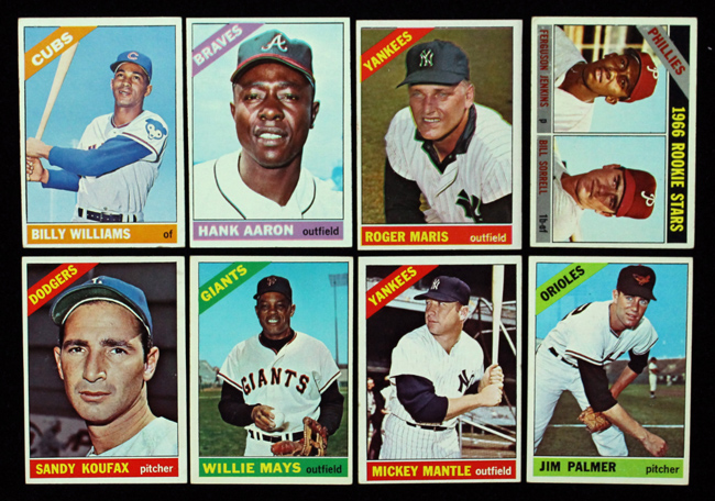 Description:Lot of (8) 1966 Topps Baseball Hall of Famer and Star cards (GD/VG-EX/MT). Includes: #s 1 Willie Mays (VG), 50 Mickey Mantle (VG/EX), 100 Sandy Koufax (EX), 126 Jim Palmer (EX), 254 Ferguson Jenkins (VG/EX), 365 Roger Maris (EX/MT), 500 Hank Aaron (EX), and 580 Billy Williams (GD/VG).