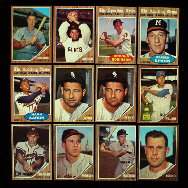 Lot of (377) 1962 Topps Baseball cards with HOFers and Stars (VG/EX-EX/MT). Some of the highlight include #s 30 Mathews, 45 Robinson, 70 Killebrew, 73 Fox, 243 Roberts, 288 Williams, (2) 385 Wynn, 394 Aaron AS, 399 Spahn AS, 468 Robinson AS, 505 Marichal, 575 Schoendienst, and 594 Uecker. Most grade EX. Range VG/EX-EX/MT