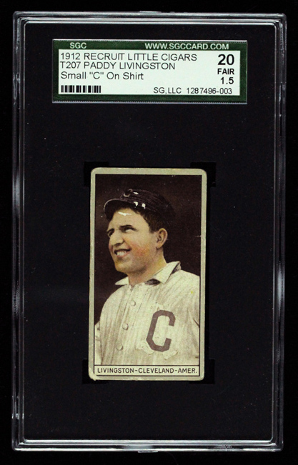 Description:1912 T207 Recruit Paddy Livingston with small "C" on shirt (SGC 20 FR). Nice example for the grade exhibiting rounded corners, some minor edge wear, and a few spots of surface loss on the front. Graded SGC 20: FR