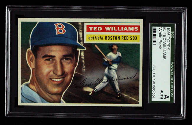 Description:1956 Topps #5 Ted Williams (appears MT, SGC Authentic). Great looking card that features near perfect centering, great color and focus, and sharp corners. The card measures up correctly, but SGC has encapsulated the card as Authentic due to possible trimming.