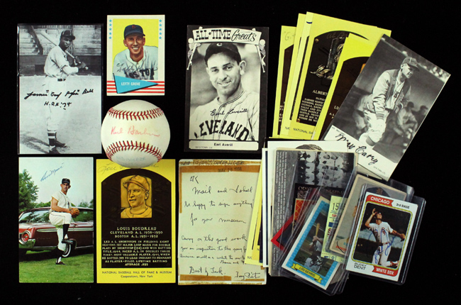 Description:Lot of assorted Baseball signed items and unsigned flats (EX-NM). Signed items include: James "Cool Papa" Bell signed 3.5"x5.5" b&w publication photo; Lefty Grove signed 1961 Fleer #38 card, Don Mossi signed 1962 Ford Motors postcard; (5) signed yellow HOF plaques with Al Barlick, Tony Perez, Happy Chandler, Lou Boudreau, and Max Carey (all except for Barlick and Boudreau are smudged); Luke Appling and Bill Terry cut signatures affixed to yellow HOF plaque postcards; Earl Averill and Max Carey signed TCMA cards; Tony Piet signed hand-written note; Red Barber single-signed B.Giamatti NL baseball (signed in red marker on the sweet spot, signature rates 7/8 out of 10, "Red Barber Dodgers Yankees Hall of Fame" is written on a side panel), and Bucky Dent and Reno Bertoia signed cards; (225) unsigned yellow Hall of Fame plaques, and (16) misc unsigned flats: EX-NM overall