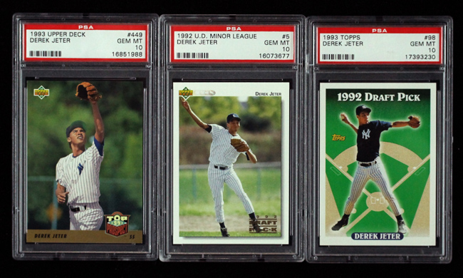 Lot of (3) 1992 and 1993 Derek Jeter rookie cards (all PSA 10 Gem Mint). Includes: 1992 Upper Deck Minor League #5 Derek Jeter, 1993 Topps #98 Derek Jeter, and 1993 Upper Deck #449 Derek Jeter. All are graded PSA 10: Gem Mint