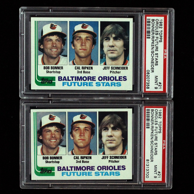 Description:Lot of (2) 1982 Topps #21 Cal Ripken Jr. rookie cards (both PSA 9 MT). Very nicely centered examples featuring sharp corners and clean front and backs. Both are graded PSA 9: MT