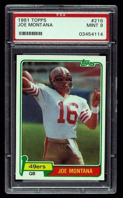 1981 Topps #216 Joe Montana rookie (PSA 9 MT). Card appears pack fresh featuring near perfect centering, sharp corners, and clean front and back. Graded PSA 9: MT