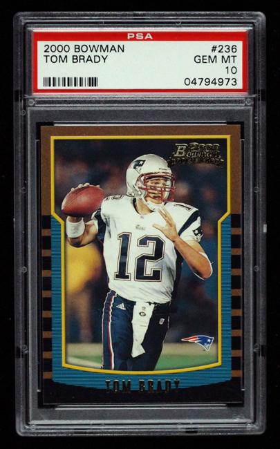 2000 Bowman #236 Tom Brady rookie (PSA 10 Gem Mint). Perfectly centered example exhibiting virtually no wear. Graded PSA 10: Gem Mint