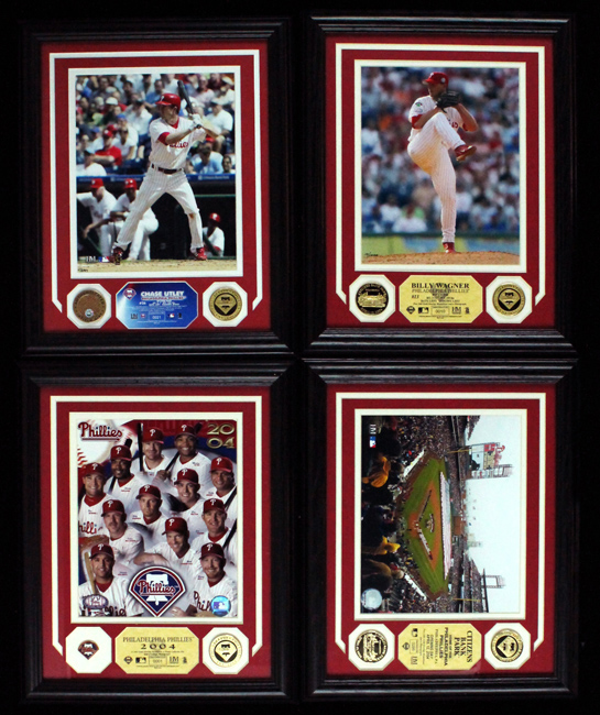 Description:Lot of (4) Philadelphia Phillies framed displays by Highland Mint, including (1) with game used infield dirt (NM). Includes 13"x16" framed Chase Utley display containing 2004 Citizens Bank Park Opening Day infield dirt (MLB Authenticated), 24kt gold overlay Phillies medallion, and Utley photo (#ed 21/2007); 13"x16" framed 2004 Phillies display containing 24kt gold overlay medallion and a team photo (#ed 1/2004); 13"x24" framed 2004 Phillies Opening Day display containing (2) 24kt gold overlay medallions and a photo (#ed 296/5000); and 13"x16" framed Billy Wagner display containing (2) 24kt gold overlay medallions and a Wagner photo (#ed 10/1000): NM appearance