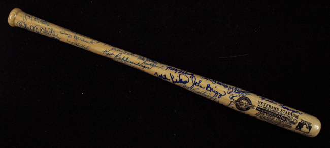 Description:Philadelphia Phillies multi-signed mini bat with (60) autographs (NM). 18" 1995 Veterans Stadium 25th Anniversary mini bat signed by (60) including Paul Owens, Eddie Sawyer, Dallas Green, Larry Bowa, Manny Trillo, Curt Simmons, Johnny Callison, Greg Luzinski, Bobby Shantz, Tony Taylor, Andy Seminick, Stan Lopata, Bob Miller, Bake McBride, Greg Gross, Ron Reed, Gary Matthews, Marty Bystrom, Milt Thompson, and many others. Signatures rate 8 to 10 out of 10: NM
