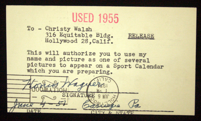 Description:Honus Wagner signed GPC sent to Christy Walsh authorizing use of his name and picture (EX/MT). 3"x5 1/4" GPC which acted as a "release" for Walsh to use Wagner's name and picture in a Sports Calendar. The typed "Release" reads "This will authorize you to use my name and picture as one of several pictures to appear on a Sport calendar which you are preparing." Wagner signed in ink and added "June 4 - 51" date and "Carnegie PA" location. The GPC is postmarked 1951 on both sides with on postmark overlapping Wagner's signature. Wagner's signature rates 9 out of 10 with note to the postmark overlapping. It appears that the GPC was slightly trimmed down from its original size. Otherwise EX/MT.