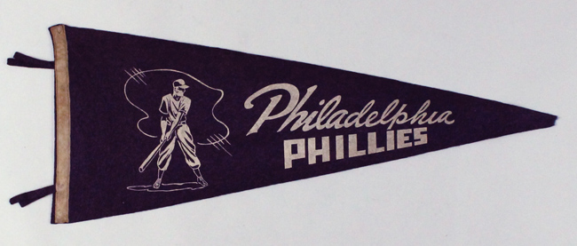 Description:Vintage Philadelphia Phillies pennant, c.1940s (EX). 28" dark purple pennant featuring a white batter graphic at the left, with "Philadelphia Phillies" in white across the pennant. Shows typical signs of wear with areas of soiling mainly visible along the white left edge, and a rounded tip. Tassels are still present: EX