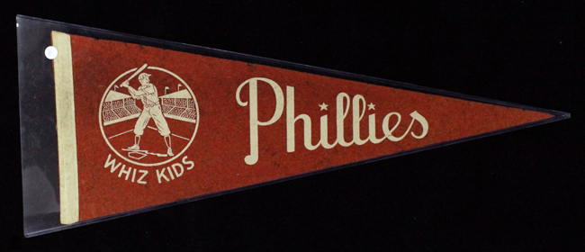 Description:Vintage Philadelphia Phillies "Whiz Kids" pennant, c. early 1950s (VG/EX). 29" red pennant featuring a white batter graphic at the left, with "WHIZ KIDS" below in white. "Phillies" is lettered in white across the pennant. Exhibits moderate wear with areas of thinning fabric and minor soiling: VG/EX