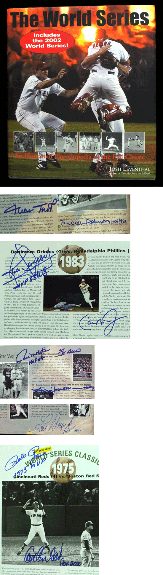 Description:Multi-signed "The World Series - An Illustrated Encyclopedia of The Fall Classic" hardcover book with (123) signatures (NM). An immensely expensive project to duplicate given the dollar figures currently charged for autographs. The book was published in 2002. There are (71) different signers throughout the book with some players signing multiple times for a total of (123) autographs. Highlights include (number of signatures noted in () if more than one): Sparky Anderson (3), Carlos Baerga, Johnny Bench (4), Yogi Berra (4), Wade Boggs, Lou Brock (5), Orlando Cepeda, Rollie Fingers (2), Carlton Fisk (2), Whitey Ford (4), Steve Garvey (2), Bob Gibson (5), Monte Irvin, Reggie Jackson (5), Tino Martinez, Willie Mays, Bill Mazeroski (2), Paul Molitor (4), Joe Morgan (4), Eddie Murray, Don Newcombe, Paul O'Neill, Tony Perez, Cal Ripken Jr., Brooks Robinson (5), Frank Robinson (2), Pete Rose (3), Mike Schmidt (2), Red Schoendienst, Tom Seaver (2), Ozzie Smith, Duke Snider (3), Earl Weaver, Dick Williams (2) Dave Winfield (2), Carl Yastrzemski, and Robin Yount. Many players added HOF or MVP inscriptions. All are signed in ink or marker and rate 9 to 10 out of 10 on average.: NM