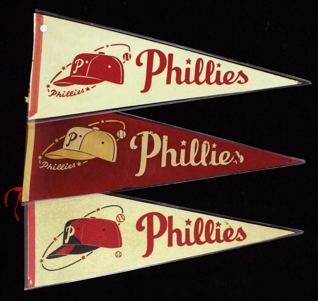 Description:Lot of (3) vintage Philadelphia Phillies pennants, c.1960s (VG-EX). Includes 29" white pennant with red Phillies hat (VG/EX-EX); 30" red pennant with white Phillies hat (VG); and 29" white pennant with red and black Phillies hat (VG-VG/EX). Range: VG-EX